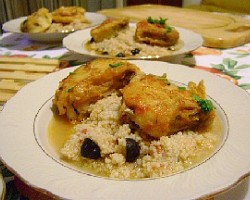 Servire con del couscous a parte (ricetta base del couscous per 4 persone: in una terrina mettere una tazzina di couscous per persona, a parte far bollire 4 tazzine di acqua con un pizzico di sale e un goccio di olio, quando bolle versare l’acqua nella terrina e coprire. Lasciare riposare per circa 5 minuti, poi sgranare con una forchetta).