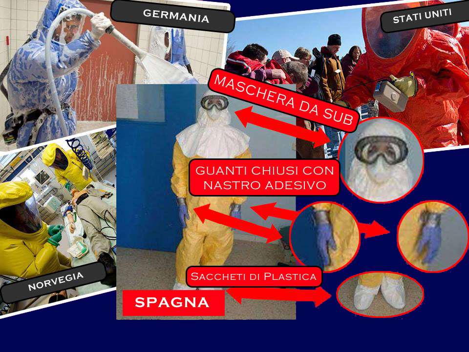 Una netta differenza di approccio: è questo quello che si nota, a prima (s)vista, guardando la foto riportata qui sotto. In pochi giorni, meglio in poche ore, in Spagna i casi sospetti di ebola sono saliti a sette, mentre un’infermiera chiamata a curare un malato di ebola è stata contagiata e le sue condizioni ora sono gravi. Come mai la donna ha contratto il virus? Forse un guanto utilizzato ha sfiorato la pelle del viso, forse è successo mentre lavava il malato. Forse.