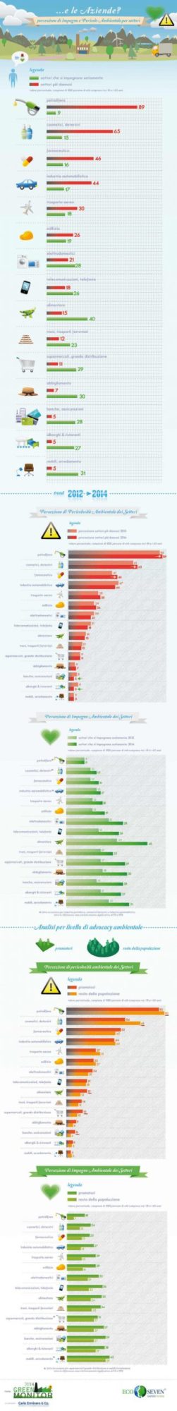 Il settore che la popolazione percepisce come più dannoso per l’ambiente e quindi anche il più pericoloso è quello petrolifero: l’89% dei campioni intervistati ritiene che le industrie petrolifere siano quelle a maggiore indice di pericolosità per l’ambiente e da questa premessa ne scaturisce anche la bassa considerazione che la popolazione ha nei suoi confronti per quel che riguarda l’impegno nel settore ambientale. Solo il 9% ritiene infatti che il settore petrolifero si impegni seriamente per diminuire l’inquinamento causato dalle sue azioni. Tra le aziende più pericolose per l’ambiente, rispettivamente con il 65% ed il 46%, quelle del settore cosmetici, detersivi e quelle del settore farmaceutico. Per i tre settori precedentemente citati è cresciuta anche negli anni la percezione di pericolosità che loro rappresentano per l’ambiente. Infatti dal 2012 al 2014 è aumentata per tutti e tre la percentuale della popolazione che li ritiene altamente pericolosi, passando dall’86% all’89% per il settore petrolifero, dal 61% al 65% per quello cosmetico, detersivo e dal 41% al 46% quello farmaceutico.