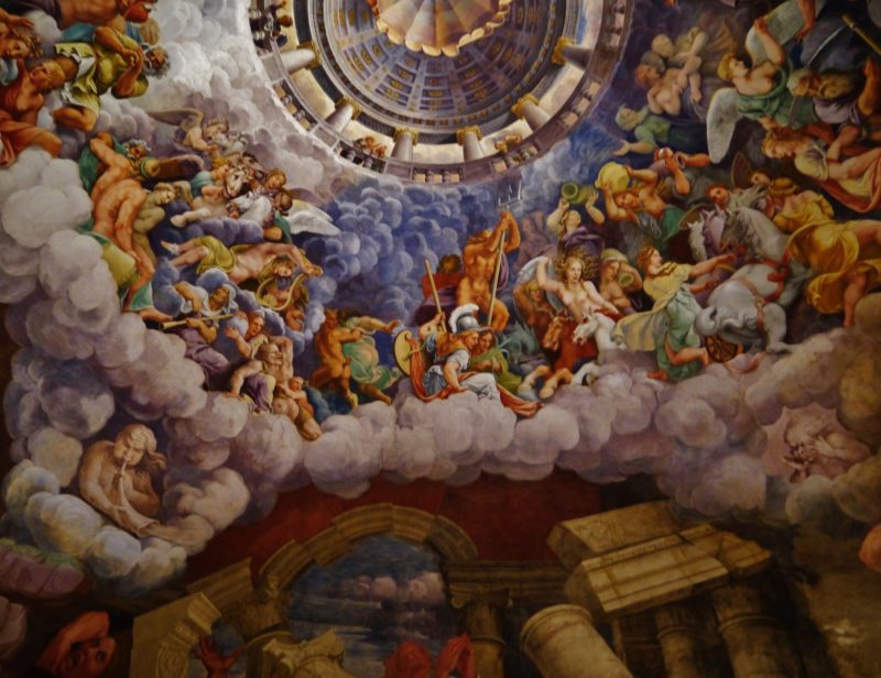 E poi la splendida Camera dei Giganti, ad opera di Giulio Romano, affrescata con scene classiche di gruppi di Titani e antiche divinità pagane.